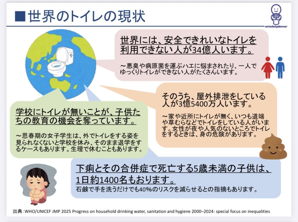 内容は、第一部「トイレってなあに?」、第二部「SDGsから考える世界のトイレの課題」、第三部「日本からSDGsを実現するとしたら?」、第四章「私たちができること」としました。