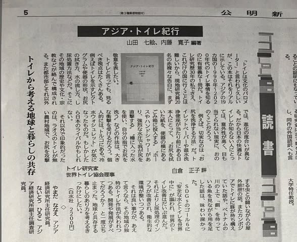 公明新聞に書評を書きました(2026年3月9日付) 2026年3月9日 最終更新日時 : 2026年3月9日 entoiletplanner 2026年1月に発刊された「アジア・トイレ紀行」の書評を書かせていただきました。2月上旬に公明新聞様よりご依頼いただきましたが、お恥ずかしいことに、それまではこの本の存在を知らず、大変助かりました。本を送っていただき、800文字のコメントを書かせていただき、掲載にいたりました。書評って、どうやって書くの?と初めての経験で、戸惑いましたが、素直な感想を書くことにしました。ぜひ本を手に取ってみてください。 Follow me! FacebooktwitterHatenaPocket